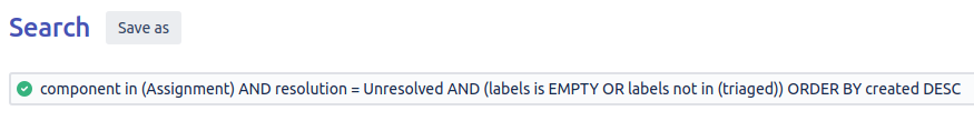 When the search query results are displayed, click the Save as button and give it an appropriate name. For instance, for the previous query you can use "Untriaged Assignment issues".